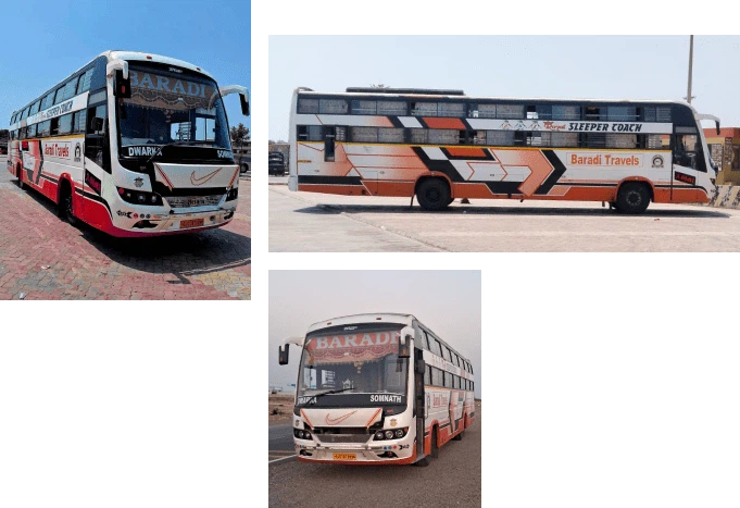Baradi Travels is travels has been consistently providing the best travel services throughout the Gujarat state and is one of the fast growing and emerging transport companies in the country. We strive to achieve numerous satisfied customers with our services. We have 24*7 customer support team, who listens and resolves any type of issues or queries of the customers. Baradi Travels also has pretty decent rates and quality buses in which the customer can get the latest luxuries and have a safe and comfortable journey. We also have caring and friendly staff for smooth and comfortable journey.